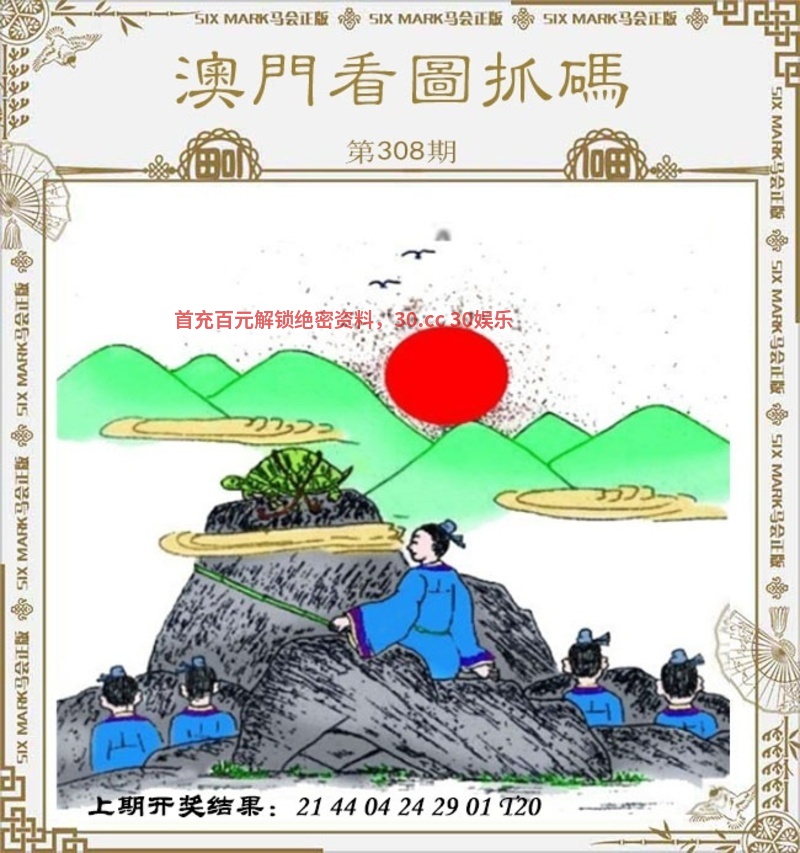 【妙解看图抓码】308期:图中有一位男子手拿着一个竹子看着前方的大乌龟,左右两边有四个人,远处有山有两只鸟和一座太阳。